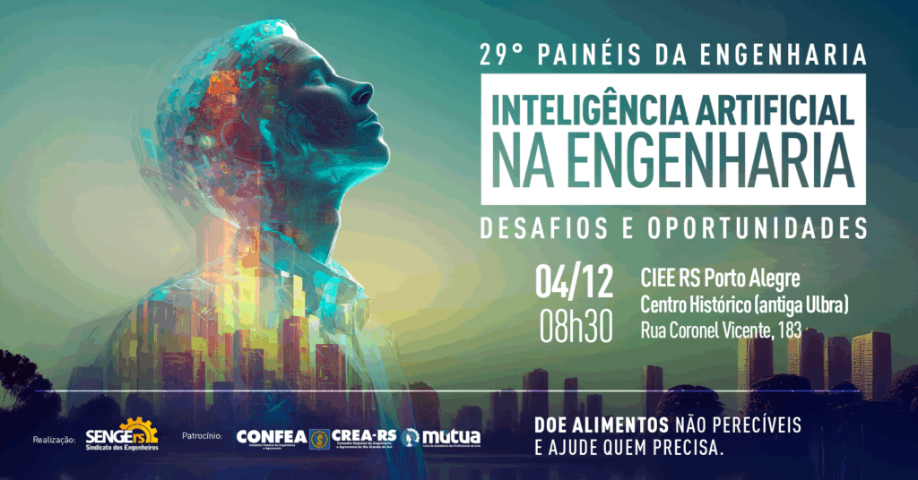 “Inteligência Artificial na Engenharia: desafios e oportunidades” é o tema do 29º Painéis da Engenharia, que acontece no dia 4 de dezembro, no CIEE-RS Porto Alegre (Centro Histórico – antiga Ulbra). Realizado pelo SENGE-RS, o evento celebra o Dia do Engenheiro e conta com o apoio do CREA-RS e CONFEA.