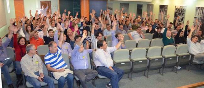 Engenheiros, geólogos e geógrafos vindos de todas as superintendências da CORSAN lotaram o auditório do Sindicato e rejeitaram a proposta apresentada pela Companhia para o Acordo Coletivo durante Assembleia Geral realizada nesta segunda-feira (8).