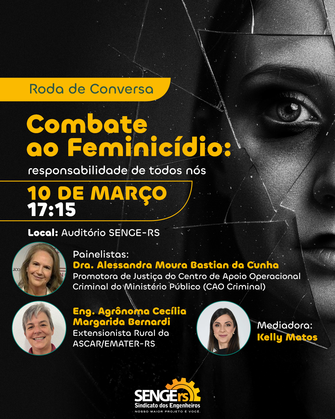 No dia 10 de março, às 17h15, o Sindicato dos Engenheiros no RS promove evento com o tema “Combate ao Feminicídio: responsabilidade de todos nós”.