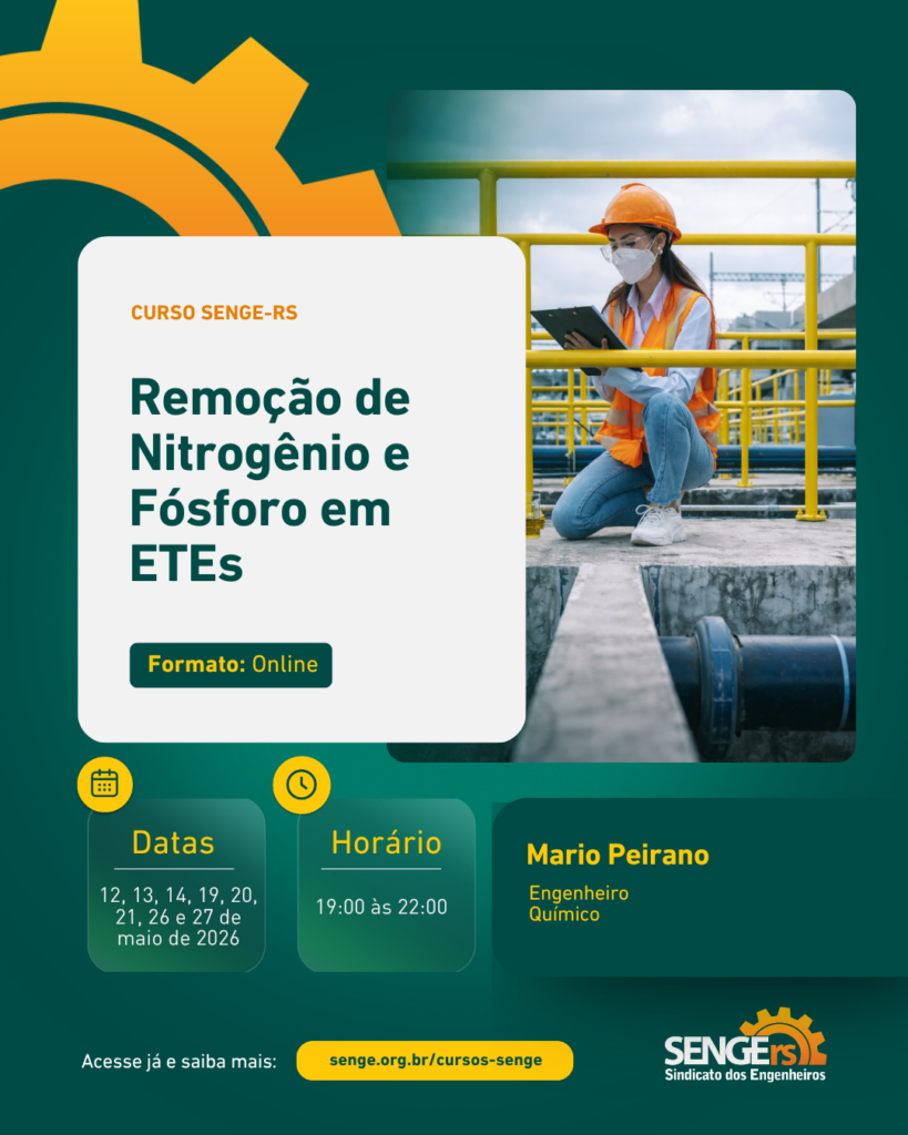 Inscrições: https://senge.org.br/produto/remocao-de-nitrogenio-e-fosforo/