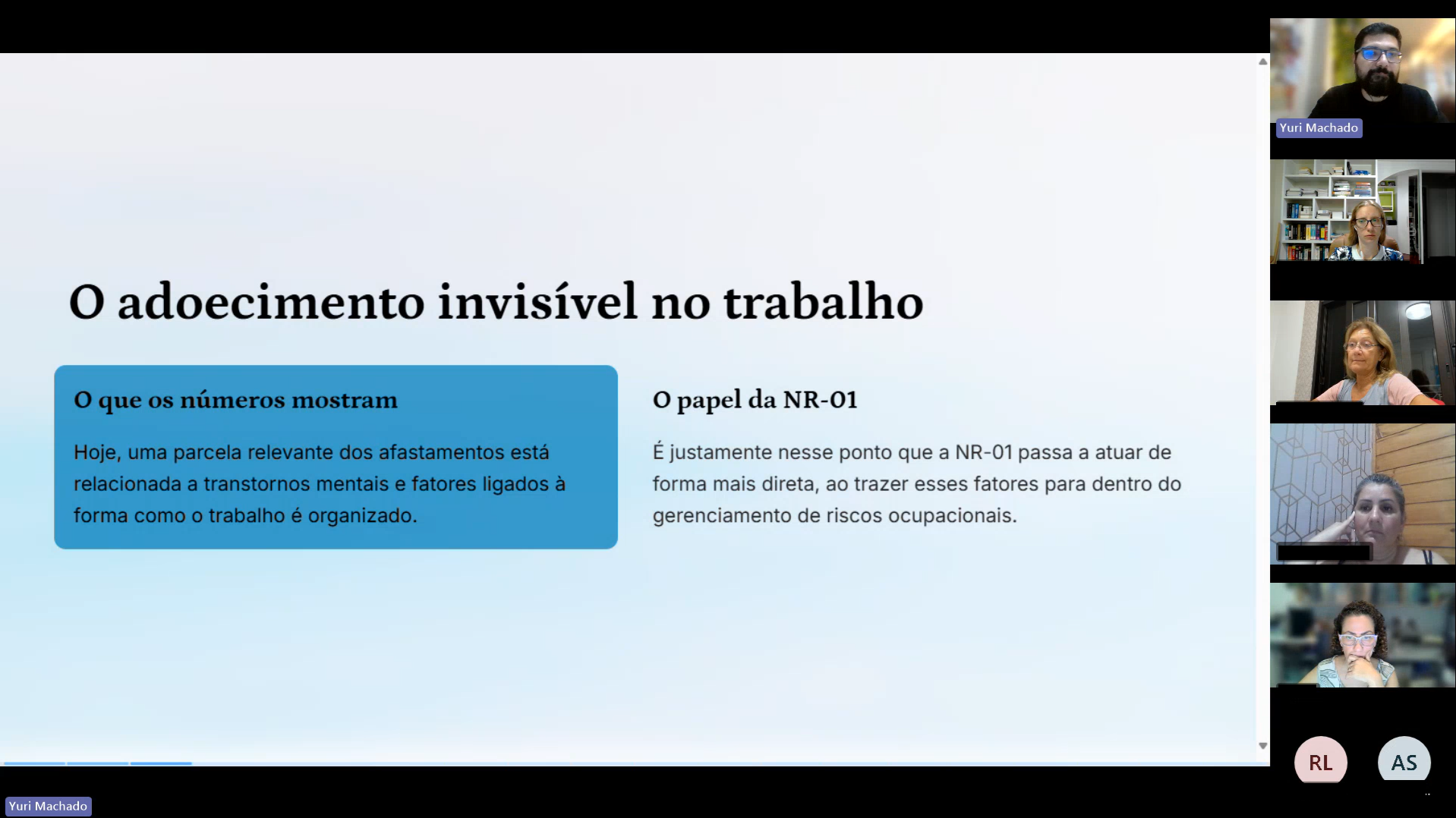 A programação também contemplou temas como o enquadramento dos riscos psicossociais no GRO, a diferença entre AEP e AET, a escuta do trabalhador como fonte de informação técnica, a aplicação de matriz de risco, a priorização de ações e o monitoramento contínuo das medidas adotadas. O curso incluiu ainda estudo de caso aplicado ao contexto profissional.