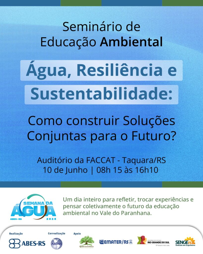 No dia 10 de junho, a cidade de Taquara/RS será palco do Seminário de Educação Ambiental, que integra a programação oficial da 32ª Semana Interamericana da Água e 25ª Semana Estadual da Água do RS. Com o tema “Água, Resiliência e Sustentabilidade: Como construir soluções conjuntas para o futuro?”, o evento promove um dia inteiro de palestras, painéis e debates voltados à construção coletiva de estratégias para o futuro da educação ambiental no Vale do Paranhana.