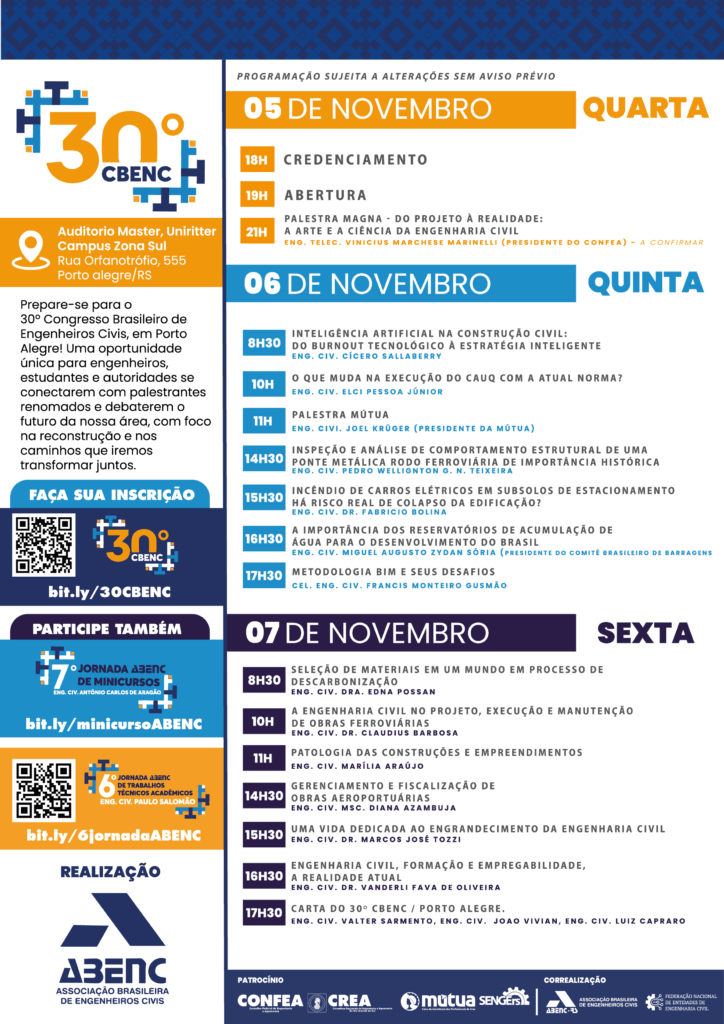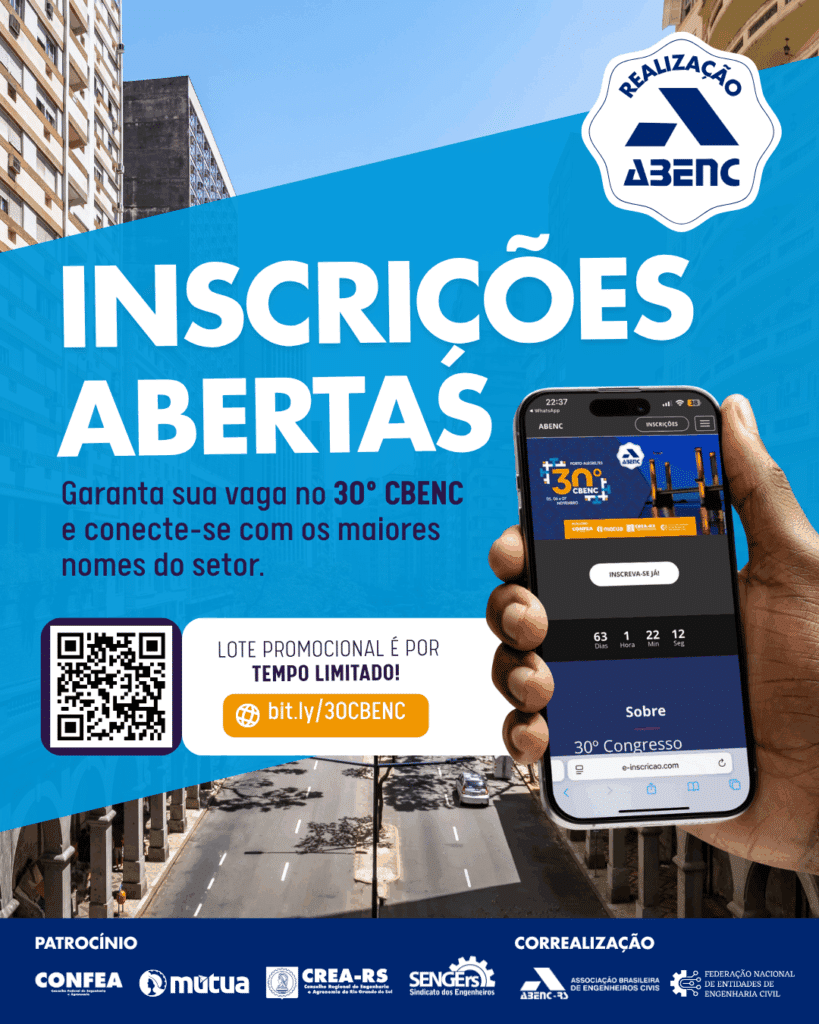De 05 a 07 de novembro de 2025, Porto Alegre sediará o 30º Congresso Brasileiro de Engenheiros Civis, promovido pela ABENC – Associação Brasileira de Engenheiros Civis.