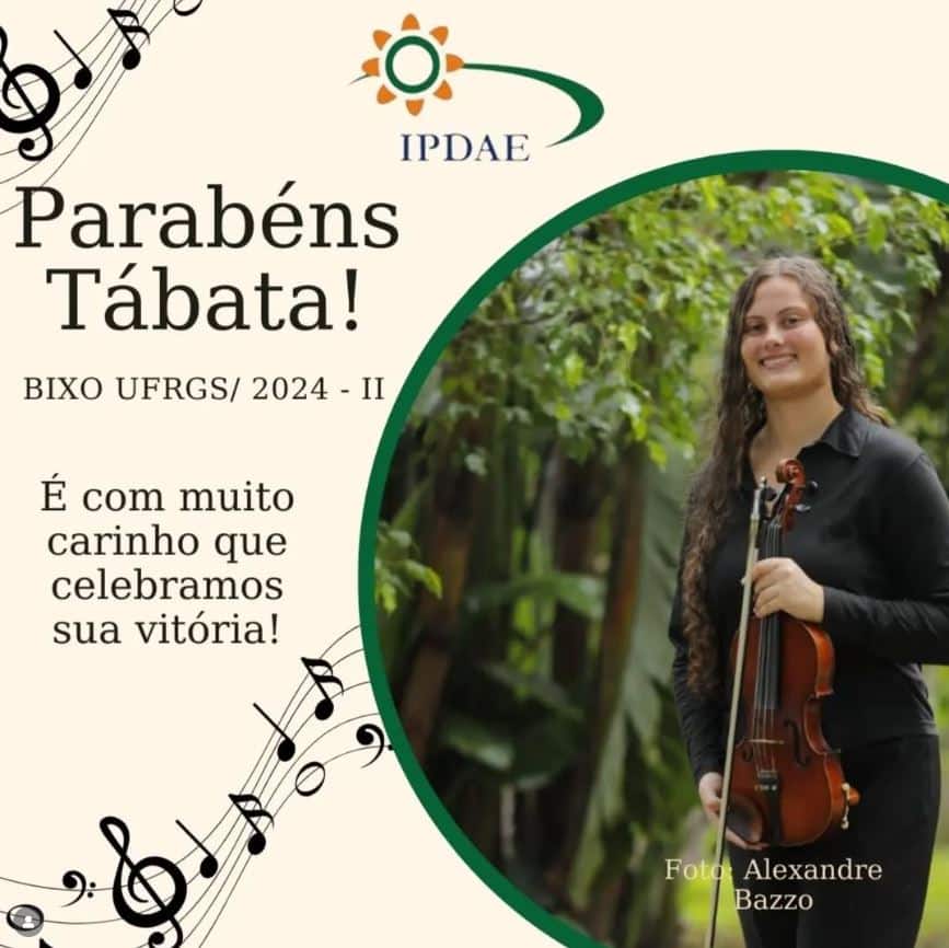 O Sindicato dos Engenheiros no Rio Grande do Sul (SENGE-RS) compartilha com satisfação um marco significativo na trajetória de uma jovem instrumentista apoiada por meio da parceria com o Instituto Porto-Alegreense de Arte-Educação (IPDAE): Tábata Stefani Stefanello, aluna da Escola de Música IPDAE na classe de violino desde os dez anos de idade, foi aprovada no vestibular da UFRGS para o curso de Bacharelado em Violino.