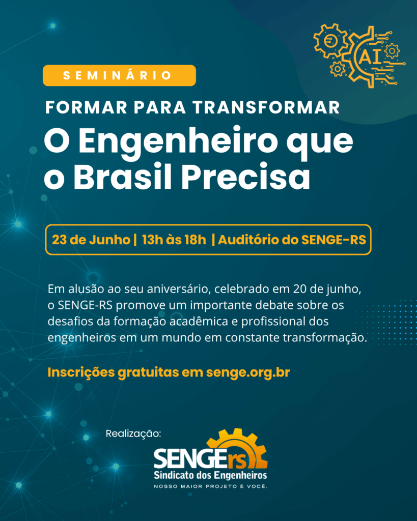No dia 23 de junho, a partir das 13h, o SENGE-RS promove o seminário “Formar para Transformar: O Engenheiro que o Brasil Precisa”, no auditório do Sindicato.
