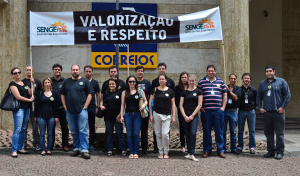 Nesta quarta-feira (11), Dia do Engenheiro, os profissionais que atuam na Empresa de Correios e Telégrafos realizaram mobilização em frente à entidade pedindo valorização e respeito à categoria. A iniciativa teve o apoio do SENGE, que foi chamado para representar os engenheiros e arquitetos nas negociações coletivas junto à empresa, na busca pelo cumprimento do Salário Mínimo Profissional, conforme a Lei 4950-A/66, e no reconhecimento da Gratificação de Responsabilidade Técnica, um direito inerente à profissão dos engenheiros e arquitetos.