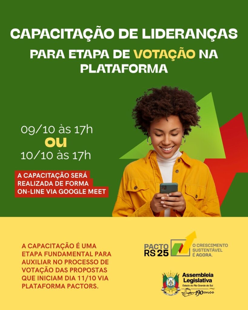 Entre os dias 11 e 26 de outubro, qualquer pessoa poderá votar nas propostas da plataforma Pacto RS 25, um espaço aberto para que a população e as categorias profissionais contribuam com ideias e prioridades para o futuro do estado. O acesso será feito pelo Gov.br, e cada participante poderá escolher até 10 propostas entre as mais de 170 disponíveis.
