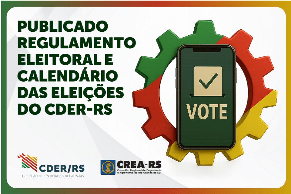 O CREA-RS, através da Comissão Eleitoral para escolha dos Coordenadores Regionais e Estadual do Colégio de Entidades Regional do Estado do Rio Grande do Sul (CDER-RS), divulga o Regulamento Eleitoral e o Calendário para os cargos de Coordenadores Regionais e Estadual do CDER-RS (titulares e suplentes), para o biênio 2026/2027, que ocorrerá em agosto, de 12 a 14 de agosto de 2025. Os candidatos interessados em concorrer aos cargos em disputa deverão observar as condições do Regulamento Eleitoral.