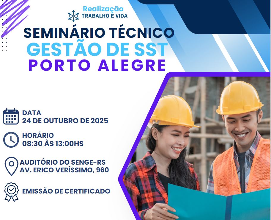 No dia 24 de outubro de 2025, das 8h30 às 13h, o auditório do SENGE-RS recebe o Seminário Técnico “Gestão de SST”, evento que reunirá especialistas, representantes de instituições públicas e profissionais da área para debater boas práticas e avanços nas normas de Saúde e Segurança do Trabalho.