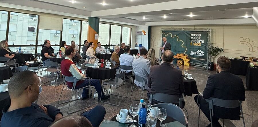 Representando o SENGE-RS, também estavam presentes o vice-presidente João Leal Vivian, os diretores administrativos, Dulphe Pinheiro Machado Neto e Nelso Portelinha, o diretor de Negociações Coletivas, Tadeu Rodriguez, e a diretora de Apoio e Qualificação Profissional, Jéssica Moraes.