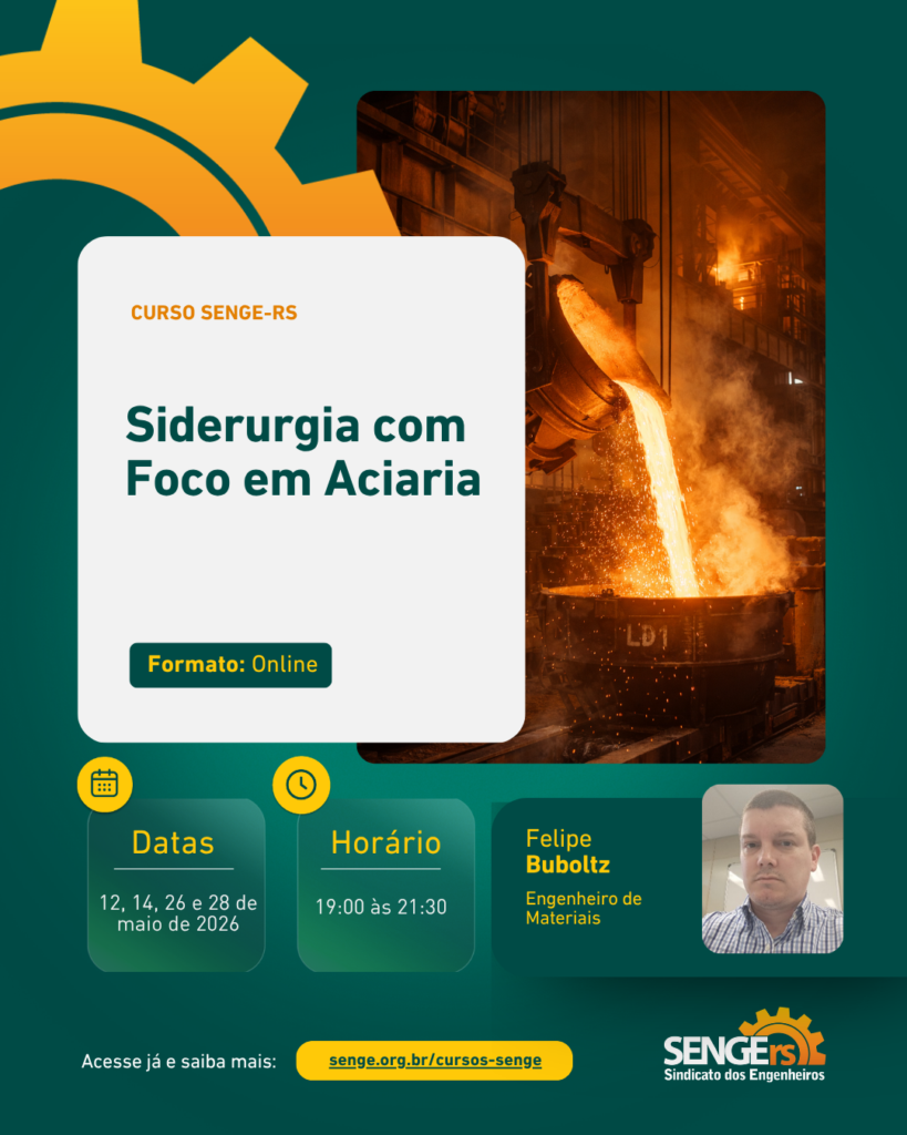 Compreender o fluxo siderúrgico, dominar os fundamentos da aciaria e entender como se produz aço de elevada qualidade são diferenciais importantes para quem atua ou deseja crescer em uma área estratégica da indústria. Pensando nisso, o SENGE-RS promove o curso Siderurgia com Foco em Aciaria, em formato online, nos dias 12, 14, 26 e 28 de maio, das 19h às 21h30.